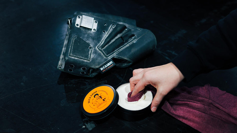 Leather is a natural product, and our Buckaroo leather is engineered by us with rich, natural oils that protect the leather over time. Water, dust, dirt, heat, cold and UV will eventually begin to weather the leather, and it will need to be rehydrated with a leather balm. We recommend at the very least an annual clean of your leather products. This should be done using a saddle soap or diluted warm soapy water. The item should be completely dry before adding a leather conditioner. Be sure to apply a liberal coating of leather conditioner, working it into any cracks and scuffs, getting good coverage across the entirety of the exterior. Follow this with a clean rag, making sure to remove any excess conditioner especially on stitching. During this process, it is a good chance to inspect the tool bag for any signs of wear and tear that may need attention or repair by Buckaroo.