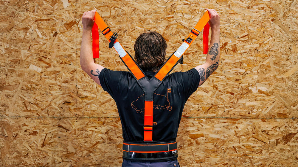 1. Buckaroo braces are designed to further support the belt, they are not designed to have the belt slung from your shoulders around your hips. Proper belt fit is a necessity. Tool belts should be worn higher than a casual belt. Buckaroo suspenders add another layer of lower back protection. They also provide an area to clip pencils, phones and other accessories too.