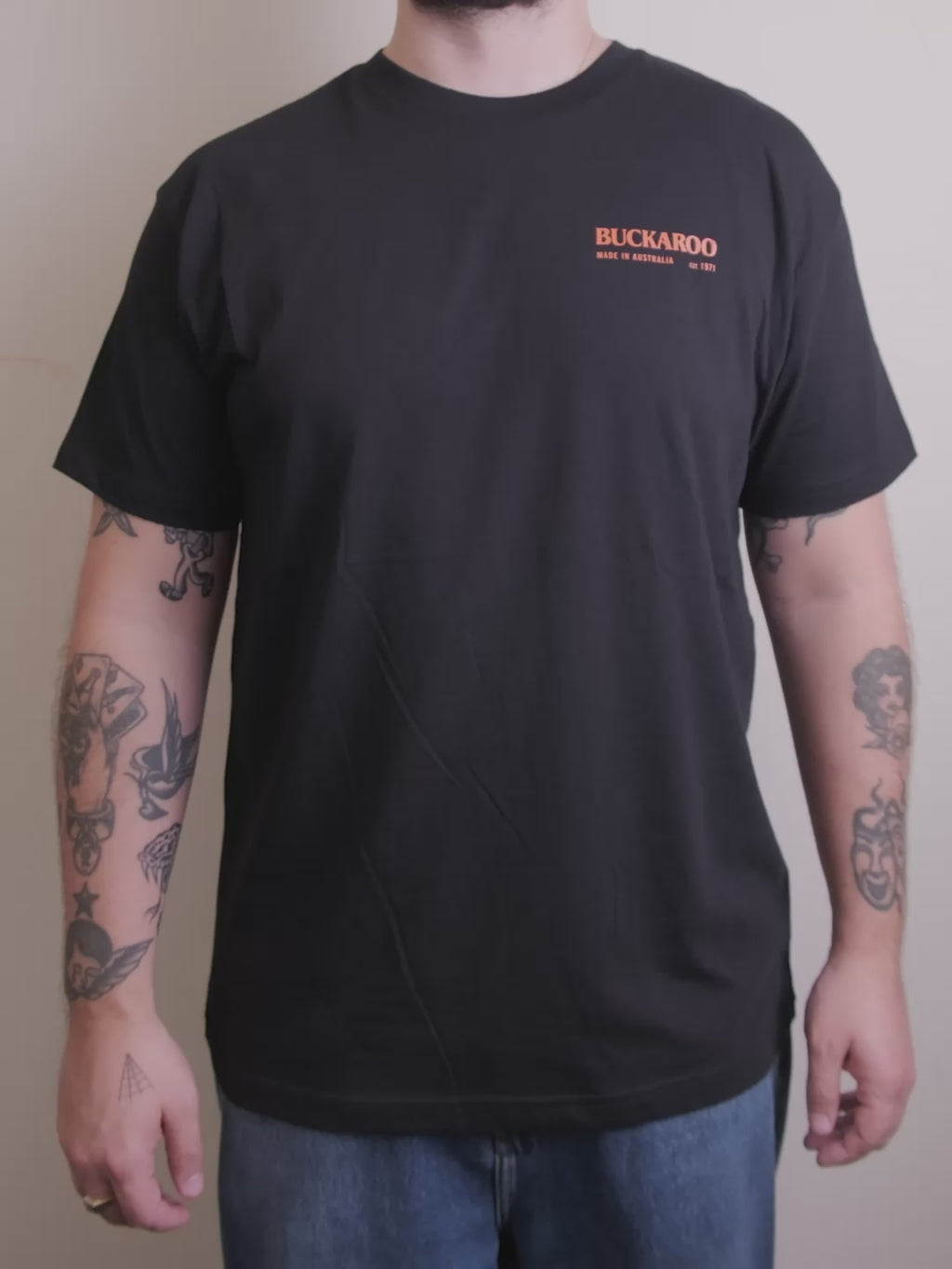 Worn by our own Buckaroo Factory Team, this t-shirt is a staple clothing item for anyone after a comfortable t-shirt for work or play. It's our staple black tee screen printed locally in Buckaroo orange — So you can join our team!