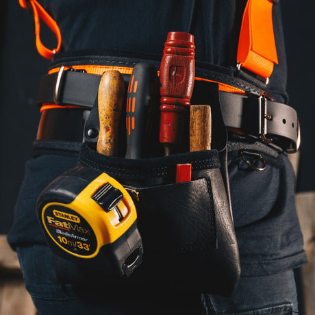 The Cabinetmakers Bag provides storage for basic tools and features a Buckaroo tape clip for hooking on a range of tools and accessories. Stores the essentials for the workshop or stepping out for a measure and quote.