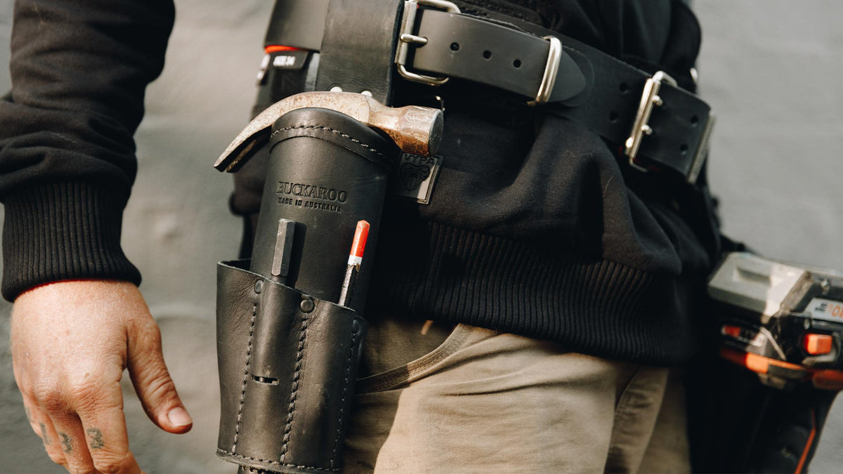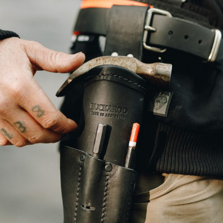 The HHJ’s curved top design is shaped to hold the hammer in place avoiding swing entirely. Also holds a variety of smaller equipment including a knife, pencil, marker, and small ruler.