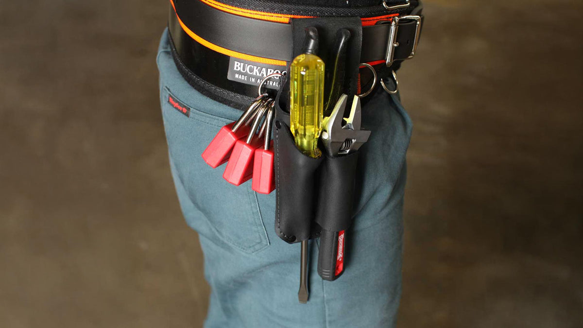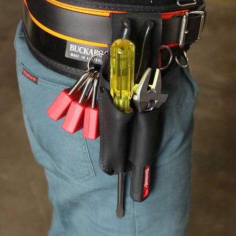 Holds a pair of Black Panther brand snips, shifter, large screwdriver and is fitted with 2 d-rings. This frog has been adopted by electricians and more, as it can holster a screwdriver, small pliers, tapes or other tools alike.
